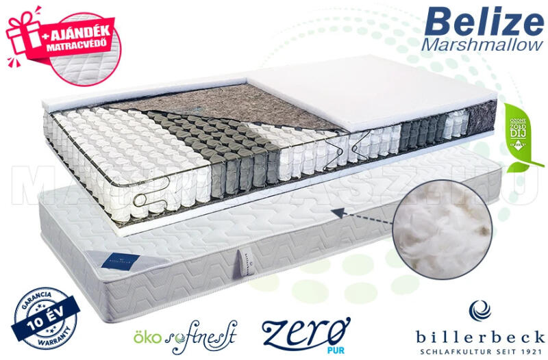 A téli- nyári oldalas BELIZE Marshmallow 5 ergonómiai zónás táskarugós matrac a Billerbeck saját fejlesztésű Öko Softnesst párnázórétegével és toll-anyagú keverék töltettel szelíd, félkemény alátámasztási erővel rendelkezik. A ZEROPUR technológia teljesen mellőzi a poliuretán habokat, vagyis nem alkalmaznak a matracban szivacs párnázóréteget vagy rugókat körbeö