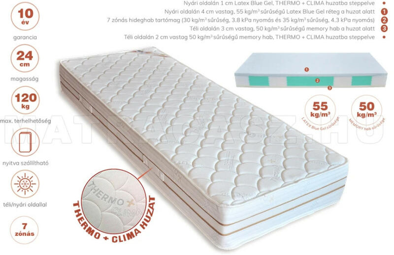 A prémium kategóriás 7 anatómiai zónára osztott téli-nyári oldalas ágybetét, mely kiválóan ötvözi a Memóriahab, – Hideg-hab, – Latex Blue Gel lapanyagokat. A nyári oldalon található Latex Blue Gel Cool alapanyag mikró kapszulákkal ellátott hűsítő hatást kelt, mely a nyári hónapok meleg éjszakáin is lehetőséget ad a tökéletes pihenésére. A téli oldalon talál