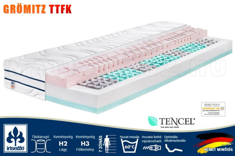 Hideghab/zsákrugós matrac német precizitás és minőség. 7 ergonómiai szektorra osztott zsákrugós magrész. 55 kg/m³ tömegsűrűségű, 7 zónás HD/HR kényelmi rétegek. 60°C-on mosható Tencel® huzattal. Az Irisette® Grömitz® TTFK hideghab/zsákrugós matrac több évtizedes, az alváskultúra területén szerzett ismeret és gyártási tapasztalat eredménye. A klasszikus német