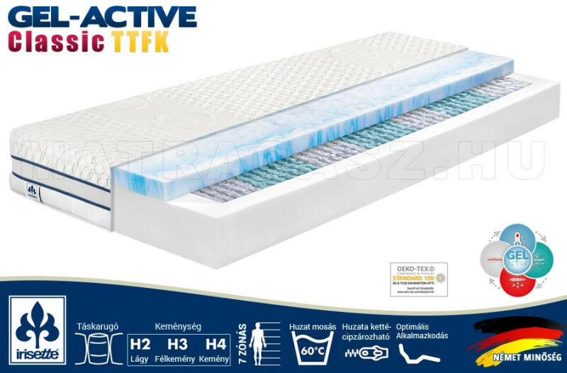 24 cm magas kellemesen lágy/félkemény táskarugós matrac. 7 különböző erősségű zsákrugó zóna. 6 cm magas Gel-active® gélhab réteg. 60 °C-on mosható huzattal. Az Irisette® Gel-active® Classic TTFK 24 cm magas táskarugós matrac karakterisztikus alátámasztó ereje új szintre emeli a rugós rendszerű matracok koncepcióját. A kellemesen lágy/félkemény komfortérzet megfe