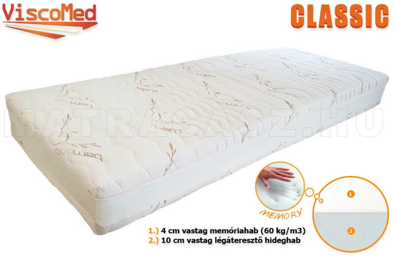 Klasszikus kemény memory matrac 4 cm nagy sűrűségű (60 kg/m3) memóriahabbal a tetején. Alul 10 cm nagy teherbírású hideghab réteggel. Lecipzározható mosható AloeVera huzat. ViscoMed Classic memóriahab matrac felső kényelmi rétege 4 cm vastag memory foam réteg mely kiváló teljesítményével megfelelő alátámasztást nyújt. (anyagsűrűség: 60 kg/m 3 ) A matrac alsó hordoz