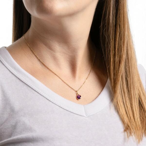 A medál mérete: 8 x 10 mmA láncra kerülő kapocs szélessége: 1,5 mmMedál súlya: 0,47 gFémjel - Van. A lánc nem tartozék. Ez az elegáns 9K sárga arany medál egyszerűségével és kifinomultságával ejti rabul. A fő elem egy könnycsepp, amely egy lila követ rejt, amely csillogóan tükrözi a fényt minden irányban. Arany sima szegély veszi körül a követ, és kiemeli annak ga