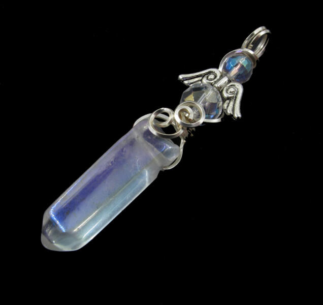 Ezüstözött drótba foglaltam, és egy kis angyallal egészítettem ki ezt az angyalaura vagy opál aurakvarc kristály drágakövet. Az angyalkához felhasznál ásvány is aura kvarc, 6-8mm-es fazettált kristály. A huzal ezüstötött réz, mely nikkelmentes, és antioxidáns bevonattal van ellátva, hogy ne oxidálódjon. Medál teljes magassága: 60mm A kvarc kristály mérete:32mm A kvarc