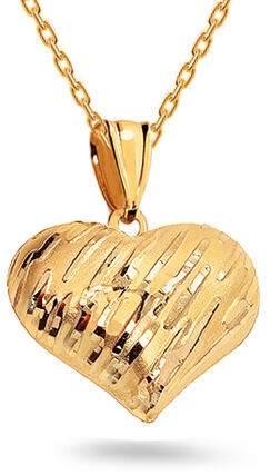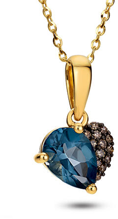 A finom, szív alakú medál 0,585 tisztaságú sárga aranyból készült. A medált egy 0,050 ct súlyú, SI1 tisztaságú, briliáns csiszolású természetes gyémánt díszíti, amely lélegzetelállítóan csillogóvá teszi az ékszert. Ezenkívül egy természetes topáz van belekeretezve, amely finom színkontrasztot ad. Méretének és romantikus stílusának köszönhetően ez az éksze