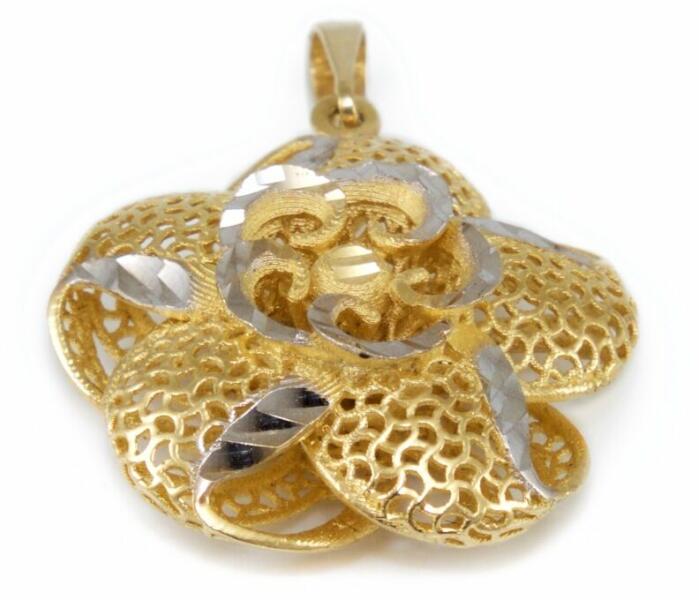 Különleges kialakítású, hálószerűen áttört, ródiummal és véséssel ékített virágot ábrázoló arany medál.