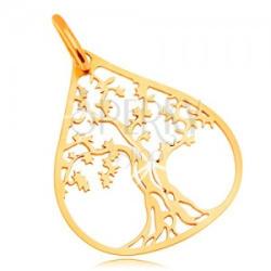 A sárga 14K arany medált egy terebélyes életfa alkotja, amely egy nagy könnycsepp vékony körvonalában helyezkedik el. A lapos medál fényes, sima felületű. A láncra kerülő szem vékony és ovális. Medál méretei: 13 x 16 mmMedál súlya: 0,2 gLáncra kerülő szem szélessége: 2 mmFémjelzéssel ellátott. Medál lánc nélkül.