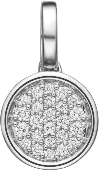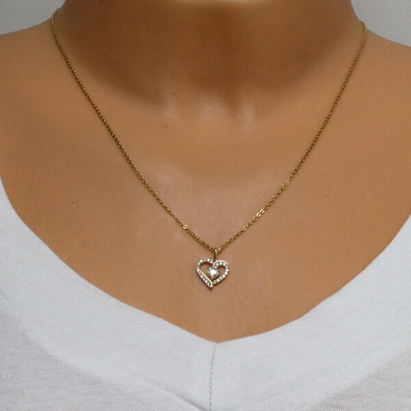Az 585 sárga arany medál aszimmetrikus szív alakú egy kivágással a közepén. A szív apró átlátszó cirkóniákkal van kirakva. Az egymást keresztező vonalak a szív tetején egy nagyobb átlátszó szív alakú cirkóniában végződnek, amelyet fényes karmok tartanak. A hosszúkás láncra kerülő szem felfelé szélesedik. A medál mérete: 12 x 12 mmA láncra kerülő szem széle