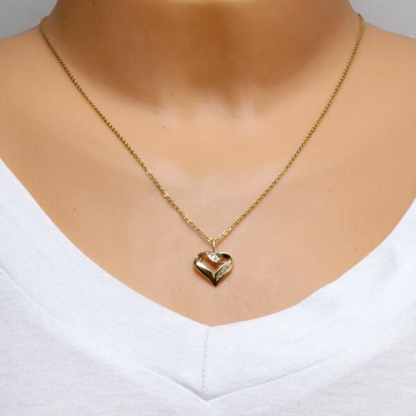 A 9K arany medált egy szív díszíti kivágással. A belső vonalat és az egyik külső vonalat csillogó átlátszó cirkóniák díszítik, míg a másik külső vonal sima és tükörfényes. A medálhoz tartozó láncra kerülő szem hosszúkás és felfelé szélesedik. A medál mérete: 14 x 14 mmA láncra kerülő szem szélessége: 2 mmA medál súlya: 0,76 gFémjelzéssel ellátva. Med