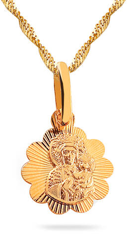 A vallásos motívumú aranymedál tizennégy karátos sárga aranyból készült. A medál virág formájú, elülső oldalát dekoratív metszet díszíti, melynek közepén a Madonna és a gyermek háromdimenziós képe.