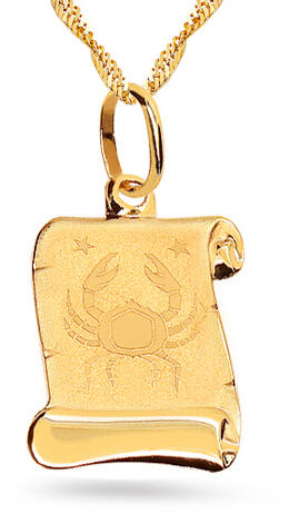 A Rák változékony kedvű, hangulatember. Ugyanakkor kedves és együtt érző. Az Állatöv otthonteremtő, családalapító jegye. Uralkodó bolygója a Hold. Elegáns medál a Rák jegyében születetteknek (június 21. - július 22. ), sárga, tizennégy karátos aranyból. A lemez hengerelt pergamen alakú, ahol a medál felületi kezelése magasfényű, mattítással kombinálva. Az Állat