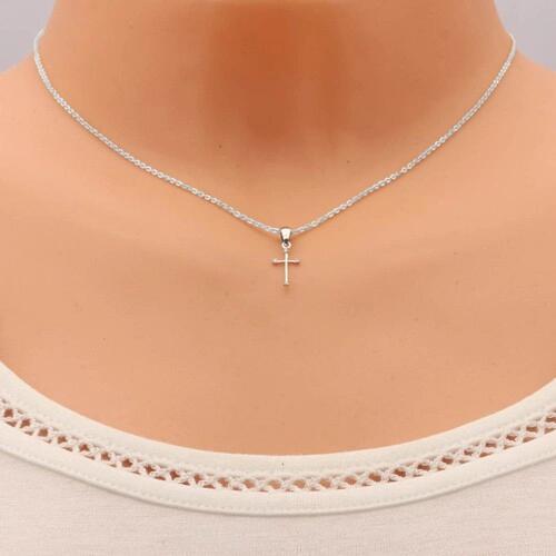 A 14K arany medált egy kis, latin kereszt alkotja vékony, egyenes szárakkal. Minden szár végén egy apró, csillogó, kerek alakú és átlátszó gyémánt van beültetve. A láncra kerülő szemnek hosszúkás és felfelé szélesedő alakja van. Medál méretei: 7 x 15 mmMedál súlya: 0,17 gEgy gyémánt átmérője: 1,1 mmGyémántok teljes súlya: 0,026 ctTisztaság: SISzín: HLáncra k