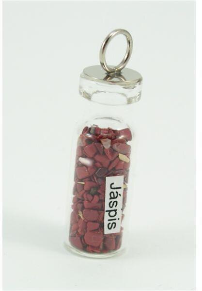Ezoterikus üveg medál, valódi ásványkövekkel. Használható medálnak, vagy talizmánnak. 3x1cm-es üvegben, piros jáspis ásványok 7mm-es karika bújtatóval teljes magasság: 4cm VIGYÁZAT! TÖRÉKENY! A jáspis gyógyhatása