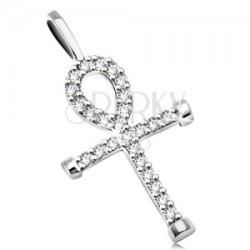 A fehér 14K arany medál egyiptomi kereszt alakú, lekerekített hurokkal a felső részében. A teljes felülete csillogó, átlátszó cirkóniákkal van kirakva. A szárak fényes és sima ívekben végződnek. A láncra kerülő szem ovális és szorosan csatlakozik a kereszthez. Medál méretei: 11 x 16 mmMedál súlya: 0,6 gLáncra kerülő szem szélessége: 2 mmFémjelzéssel ellátott. M