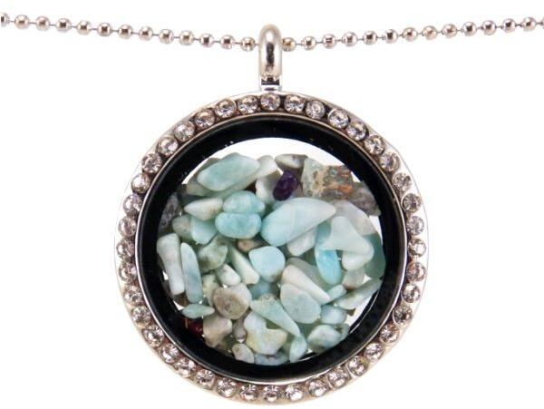 Nagyon sejtelmes, kicsit kaleidoszkópos medálkát készítettem ezekből az aprócska larimár ásványokból. A két üveglap közt mozgolódó kristályok mindig más mintázatot mutatnak. A medálka nyitható, de a zárat a biztonság kedvéért rögzítettem. A medál egyik oldala körbe csillogó kristályokkal van díszítve, a másik fele sima. A medál és a hozzávaló nyaklánc színe