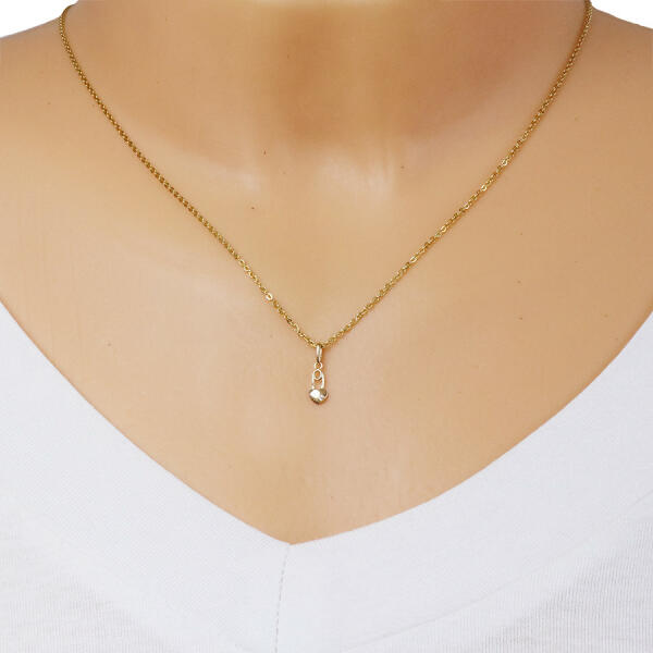 A 375 arany medál egy biztosítótűből áll, amely egy teli szívben végződik. A tükörfényes szívet egy apró átlátszó cirkónia díszíti. A láncra kerülő szem keskeny, felfelé szélesedik. A medál mérete: 4 x 10 mmA láncra kerülő szem szélessége: 1,5 mmA medál súlya: 0,15 gFémjelzéssel ellátva. Medál lánc nélkül.