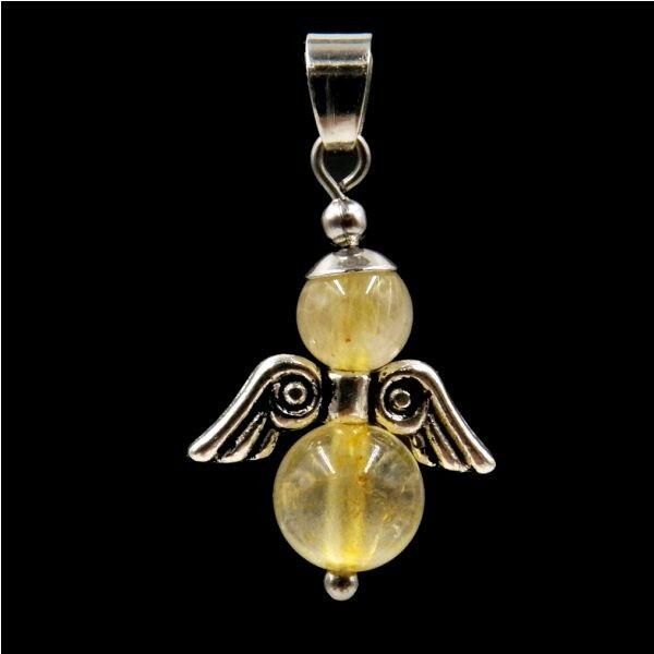 Természetes rutilkvarc gyöngyökből készült angyal medál. A kvarckristályok színe lehet aranysárga vagy áttetsző kvarc kristályban lévő rutill tűk. Az angyalka szárnya is választható, tibeti ezüst fém, vagy irizáló műanyag. Gyöngyök mérete: 6-8mm Teljes magassága: 3cm A Rutilkvarc gyógyhatása