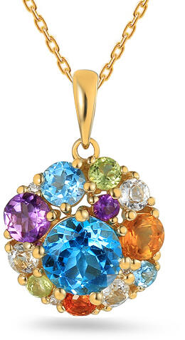 A Dubai kollekció 14 karátos sárga aranyból készült medálja egy egzotikus hangulatú, luxus ékszer, amely gyönyörűen kiegészíti a természetes drágakövek sokaságát. Az ametisztektől és citrintől kezdve az olivinon és topázon át az apró, briliáns csiszolású gyémántokig minden egyes kő egyedi színt és különlegességet kölcsönöz az ékszernek. A 0,0200 karátos, H
