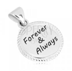 925 ezüst medál, kör alakzat. A medál szélét vágatok díszítik, az első részén "Forever & Always" felirat található amely fekete fénymázzal van kitöltve. A medál hátsó része sima, fényes. A láncra kerülő szem hosszúkás, felfelé enyhén szélesedik. Medál mérete: 14 mmLáncra kerülő szem szélessége: 3 mmSúly: 2,7 gFémjelzéssel ellátott. Medál lánc nélkül