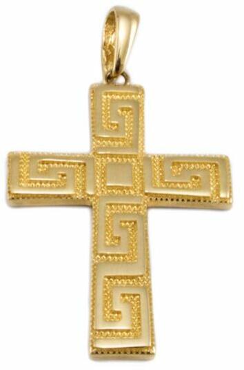 Klasszikus és kedvelt fazonú, matt és görög mintával díszített, mind két oldalán hordható, arany kereszt medál.