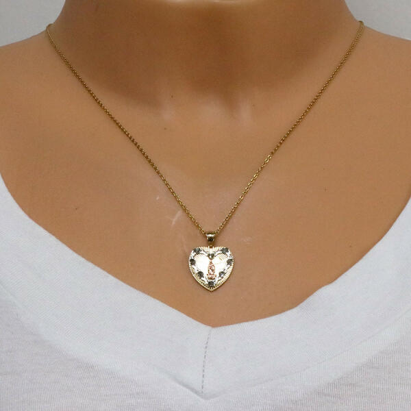 375 kombinált arany medál szív alakú alapon, hosszúkás bevágásokkal. Az alapon végtelen szimbólumokkal és kisebb szimmetrikus szívekből álló szív kontúr van. A kontúr közepén a köpenyes, imádkozó Szűz Mária. A láncra kerülő szem a teteje felé kiszélesedik. A medál méretei: A medál mérete: 17 x 19 mm A láncra kerülő szem szélessége: 3,5 mm. A medál súlya: 2,