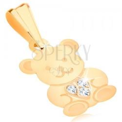 375 arany medál tükörfényű lapos medvével, mely enyhe gravírozással és kis apró cirkóniával díszített. A szívbe három apró átlátszó cirkónia van beültetve. A medál hátsó oldala sima és fényes. A láncra kerülő szem hosszúkás és felfelé haladva enyhén szélesedik. A medál mérete: 8 x 10 mmA medál súlya: 0,2 gFémjelzéssel ellátott. Medál lánc nélkül. A r