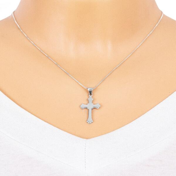 Tükrösen fényes kereszt alakú medál sterling ezüstből. A kereszt szárai enyhén szélesednek és hármas hullám alakban végződnek. A szárak találkozásánál a kereszt négyzet alakú. Sima felület. Méret: 16 x 25 mmA láncra kerülő szem szélessége: 2 mmA függő tömege: 1,8 gFémjelzéssel ellátott. A medál lánc nélkül kapható.