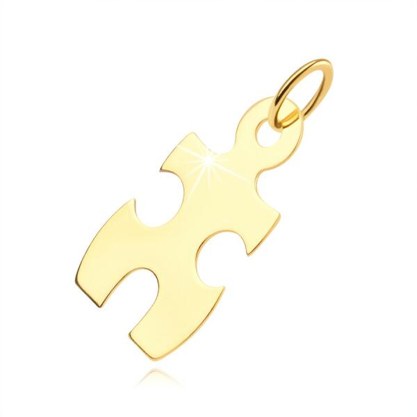 A 14K sárga aranyból készült medál puzzle-darab formájában. Két hosszabb és egy rövidebb oldalán jellegzetes puzzle kivágások díszítik. A felső részen egy apró kerek kivágással ellátott összekötő láncszem található, amelyen keresztül egy ovális láncra fűzhető láncszem van felfűzve. A medál mérete: 11,5 x 19 mm. A medál súlya: 0,4 gA láncra fűzhető láncszem