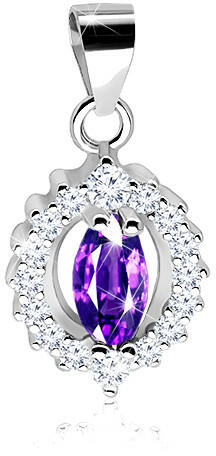 925 ezüst medál lila színű cirkóniával, amely búzaszem alakúra van csiszolva és foglalatba helyezve. A szegély csillogó, átlátszó cirkóniákkal van kirakva. A felső részén található a láncra kerülő szem. Medál mérete: 11 x 17 mmLáncra kerülő szem szélessége: 3 mmSúly: 1,22 gFémjelzéssel ellátott. Medál lánc nélkül. A ródiummal kezelt felület biztosítja az