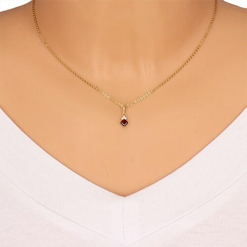 Medál 14K sárga aranyból, két egymást fedő négyzettel. A nagyobb négyzetet egy piros gránát alkotja foglalatban négy karommal odaerősítve. Felette egy kisebb négyzet található három, kerek, átlátszó, csillogó cirkóniával. A láncra kerülő szem ovális alakú. A medál méretei: 6 x 9 mmA medál súlya: 0,4 gA láncra kerülő szem szélessége: 1,5 mmFémjelzéssel elláto