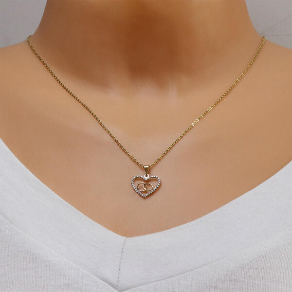 A 14K arany medál egy szívvonalat ábrázol, teljes kerülete mentén kerek csillogó átlátszó cirkóniával díszítve. A medál belsejében két egymásba fonódó sima fényes kör található. A medálon egy, a teteje felé szélesedő láncra kerülő láncszemmel rendelkezik. Medál mérete: 14 x 13 mm A láncra kerülő láncszem szélessége: 2 mm A medál súlya: 0,4 g Fémjel - Van.