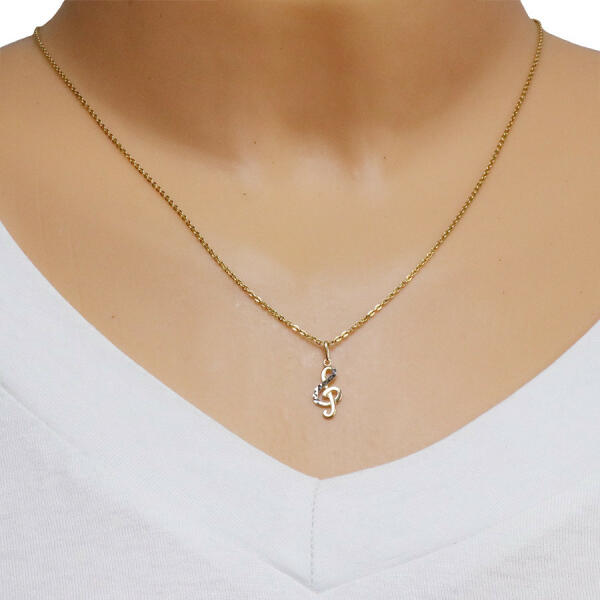 9K kombinált aranyból készült medál egy violinkulcs motívumot ábrázol. A medál felülete enyhén domború és tükörsima. A violinkulcsot, fehér aranyból készült, vésett háromszögek díszítik. A láncra kerülő szem ovális alakú, és a teteje felé kiszélesedik. A violinkulcs mérete: 7 x 15 mm. A láncra kerülő szem szélessége: 1,5 mm Medál súlya: 0,33 g Fémjel - Van.