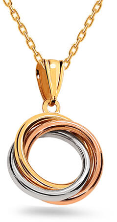 A modern kerek medál három arany vonalból áll, három színű aranyból, amelyek összefonódnak. Az ékszer felülete magasfényű.