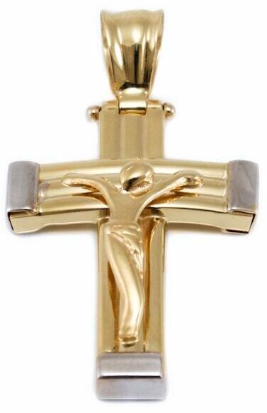 Modern stílusú, ródiummal és domború mintával díszített, üreges kialakítású arany feszület medál.