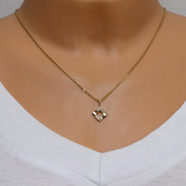 Az 375 sárga arany medál négyzet alakú, amelyet egymásba fonódó vonalak alkotnak. Két vonal sima és tükörfényes, a másik kettő három kerek átlátszó cirkóniával van kirakva. A hosszúkás láncra kerülő szem felfelé szélesedik. A medál mérete: 12 x 14 mmA láncra kerülő szem szélessége: 1,5 mmA medál súlya: 0,51 gFémjelzéssel ellátva. Medál lánc nélkül.