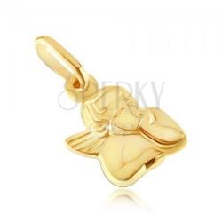 Arany medál kidomborodó angyal fejjel fényes felszínnel és kidolgozott részletekkel. Az angyalkának hullámos haja van és egyik kezével támasztja a fejét. A hátsó része sima. Méretek: 9 x 12 mmA medál súlya: 1 gA láncon lévő szem szélessége: 3 mmMedál lánc nélkül. Fémjelzéssel ellátott.