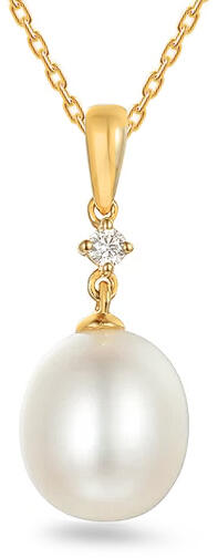Tizennégy karátos sárga aranyból készült medál, gyémántokkal és édesvízi Biwa gyöngyszel, fehér színben díszítve. A medál fűzőlyukát 0,030 ct össztömegű, H színű és SI1 tisztaságú gyémánt díszíti. A gyöngy ovális könnycsepp alakú, méretei 9 x 10 mm, a medál hossza 22 mm, a medál szem átmérője 3 mm. A kövek iZlato® eredetiségigazolással rendelkeznek. A