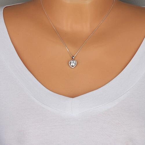 A ródiummal kezelt felületű 925 ezüst medál szimmetrikus szív körvonal alakú, amely átlátszó, csillogó cirkóniákkal van kirakva. A szív közepébe egy kerek, átlátszó, csiszolt felületű cirkónia van helyezve. A láncra kerülő szem sima és fényes, felfelé szélesedik. A medál mérete: 12 x 13 mmA láncra kerülő szem szélessége: 3 mmA medál súlya: 2,26 gFémjelzésse