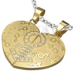 Luxus medál szerelmes pároknak, arany színben, kettétörhető szív alakban, férfi és női szimbólumokkal. A szív közepén egy nagy Vénusz jel található, mely tiszta cirkónia kövekkel van kirakva. A medál mérete: 40 x 30 mmA láncra kerülő szem mérete: 5 mmMedálok lánc nélkül.