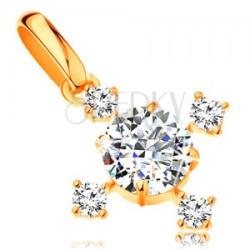 Kereszt alakú medál 14K sárga aranyból, amelynek a szárai kerek, átlátszó cirkóniákkal vannak kirakva. A közepében egy nagyobb, kidomborodó, átlátszó, kerek cirkónia található. A láncra kerülő szem ovális alakú. Medál méretei: 11 x 11 mmMedál súlya: 0,6 gA láncra kerülő szem szélessége: 2 mmFémjelzéssel ellátott. Medál lánc nélkül.