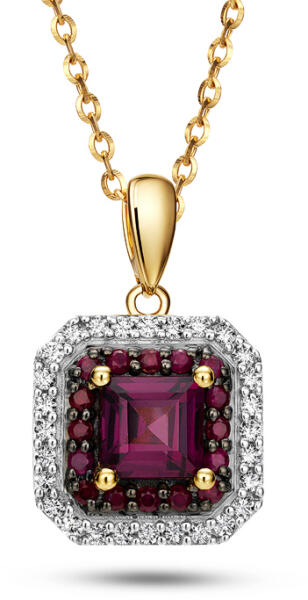 Az ékszerek fő díszei a natúr rodolitok (0,93 ct) és a rubinok, melyek élénk színeikkel szemet gyönyörködtető kontrasztot alkotnak a sárga arannyal. A 0,17 ct össztömegű gyémántok csillogást adnak a dizájnhoz. Ez a medál azoknak a nőknek készült, akik eredeti dizájnnal és luxus részletekkel rendelkező ékszert keresnek. Ideális kiegészítője báloknak, gálaesteknek