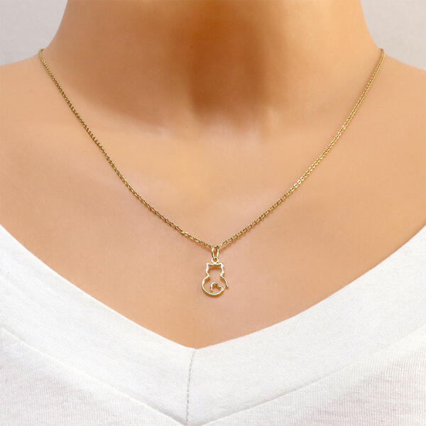 A 14K sárga aranyból készült medál , egy kis füllel és farokkal ellátott cica vékony körvonalát formázza. A cica farka befejezetlen szív alakú. A medál felülete sima és fényes. A lánc kapcsa ovális alakú. Medál mérete: 9 x 15 mmMedál tömege: 0,3 gA kapocs szélessége: 2 mm Fémjel - van. A lánc nem tartozék!