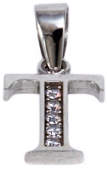 Kedvelt fazonú, cirkónia kősorral ékített, ródiummal bevont "T" betű arany medál.