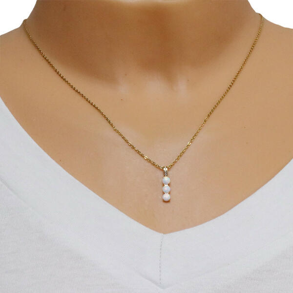 A 9K sárga arany medált egy kerek, fehér színű és szivárványos visszfényű szintetikus opálokból álló sor alkotja. A foglalatok, amelyekbe az opálok vannak ágyazva, egy ovális láncra kerülő szemen függnek. A láncra kerülő szemet egy apró átlátszó cirkóniákból álló sáv díszíti. A medál mérete: 4 x 19 mmA medál súlya: 0,35 gA láncra kerülő szem szélessége: