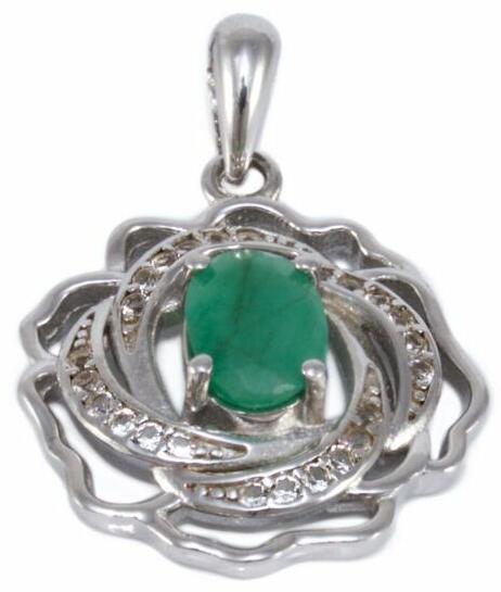 Modern stílusú, kedvelt fazonú, ródiummal bevont, smaragddal és cirkónia kővel ékített, magasított karmos foglaltú, áttört virág ezüst medál.