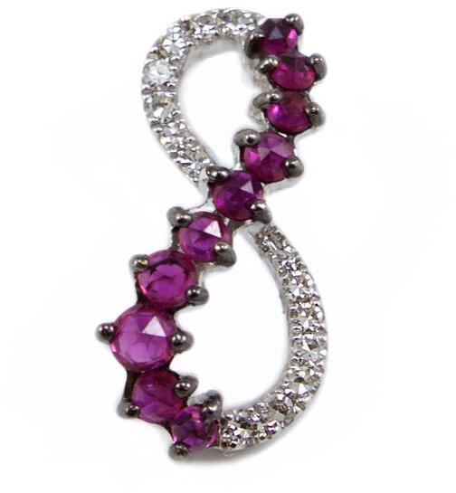 Kedvelt fazonú, végtelen jelet ábrázoló, rózsaszín kövekkel és gyémántokkal ékített, fehérarany futó medál.