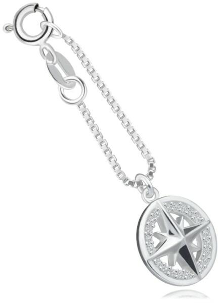 A 925 ezüst medál sima, szögletes láncszemekből áll, amelyek függőlegesen kapcsolódnak egymáshoz. A díszítő rész kör alakú, amely átlátszó cirkóniákkal van kirakva. A kör közepén egy iránytű van beillesztve. A medált rugós gyűrűzárral rögzíthető a karkötőhöz vagy lánchoz. Medál átmérője: 12 mm Lánc szélesség: 1,1 mm Lánc hossza: 40 mmMedál súlya: 2,0