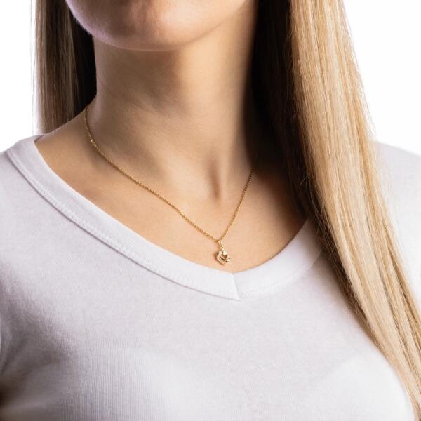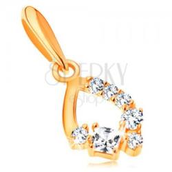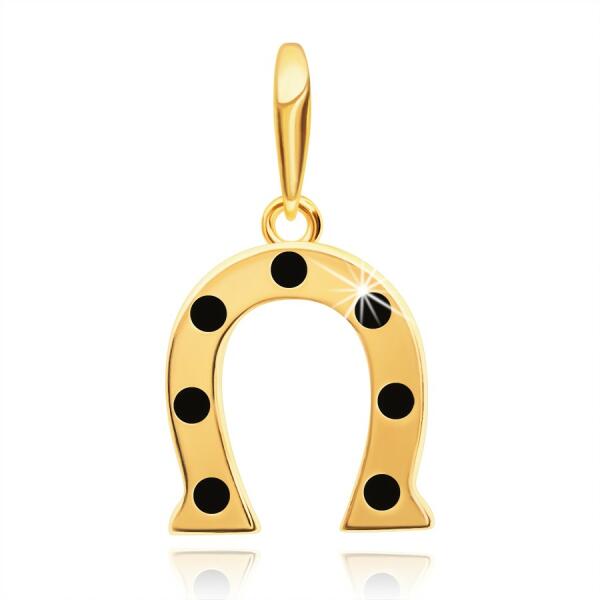 14K sárga arany medál, kis patkó alakban, amely a szerencse szimbóluma. A medál felülete tükörfényes és sima, valamint fekete fénymázas pöttyök díszítik. A patkó szárvégei enyhén szélesednek. A medál hátsó része tömör. A láncra kerülő szem vékony és hosszúkás alakú, felfelé szélesedik. Medál mérete: 9 x 10 mmSúly: 0,6 gA láncra kerülő szélessége: 1,5 mm