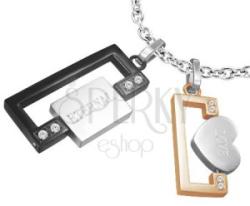 Acél medál szerelmeseknek. Fiú medál fekete színben forgatható ezüst éremmel, melyen "ETERNAL" felirat szerepel. A fekete téglalapon négy cirkónia van beágyazva. Lány medál réz színben forgatható szívecskével, melyen "LOVE" felirat szerepel. A réz téglalap négy cirkóniával díszített. Nagyobb medál méretei: 15 mm x 27 mmKisebb medál méretei: 13 mm x 22 mmLáncra kerül