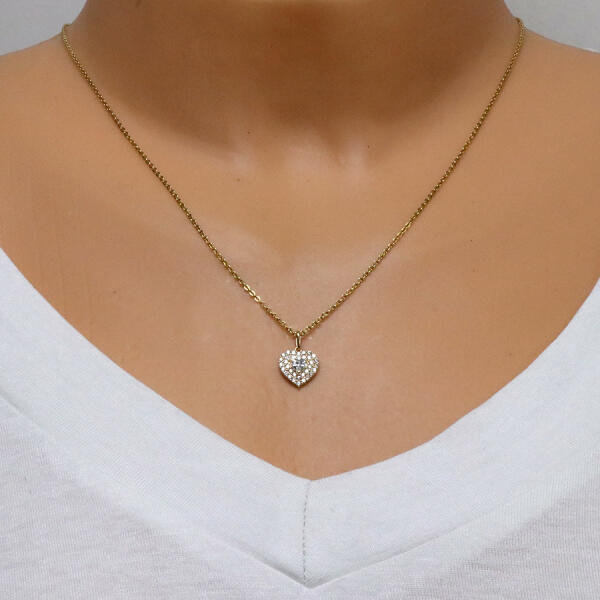 A medál 14K aranyból készült és szív alakú. A szívet csillogó átlátszó cirkóniák sűrűn díszítik. A közepében, két pálca között, egy kisebb cirkónia szív található. A láncra kerülő szem ovális alakú, felfelé szélesedik. A medál mérete: 10 x 11 mmA láncra kerülő szem szélessége: 1 mmA medál súlya: 0,7 gFémjelzéssel ellátva. Medál lánc nélkül.