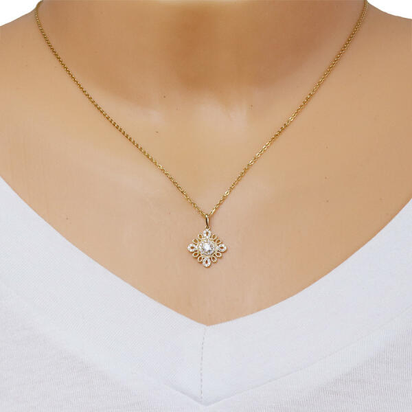 A 375 arany medált egy spirális körvonal alkotja, amely virág alakú. A kerek vonalakat átlátszó cirkóniák és apró bemetszések díszítik. A virág közepébe egy átlátszó cirkónia van helyezve. A hosszúkás láncra kerülő szem felfelé szélesedik. A medál mérete: 14 x 16 mmA láncra kerülő szem szélessége: 1,5 mmA medál súlya: 0,8 gFémjelzéssel ellátva. Medál lánc
